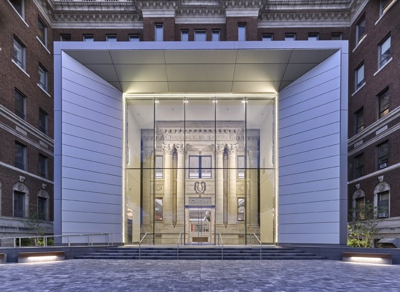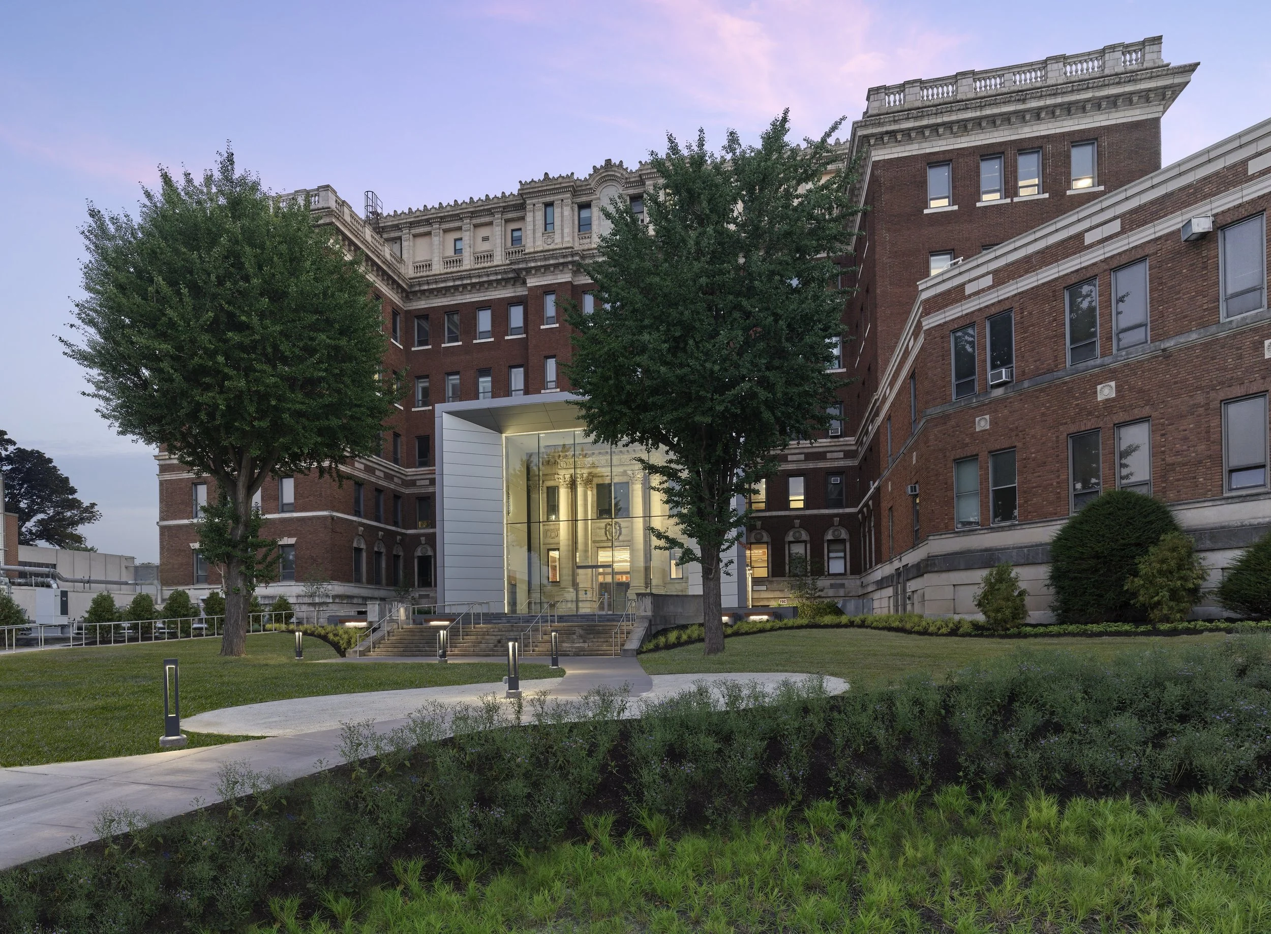 At the PHMC Public Health Campus on Cedar, that shift begins at the entrance. A new pavilion bridges historic preservation and contemporary expression, marking a clear transition between past and present. A 38.5-foot structural glass wall reveals the original limestone façade, turning the threshold into an open invitation. Ramps and discreetly integrated elevators provide access to a main level five feet above grade, removing barriers while preserving the building’s presence. From arrival, visitors are oriented toward care, services, and a Community Health Hub connecting people to essential resources.
