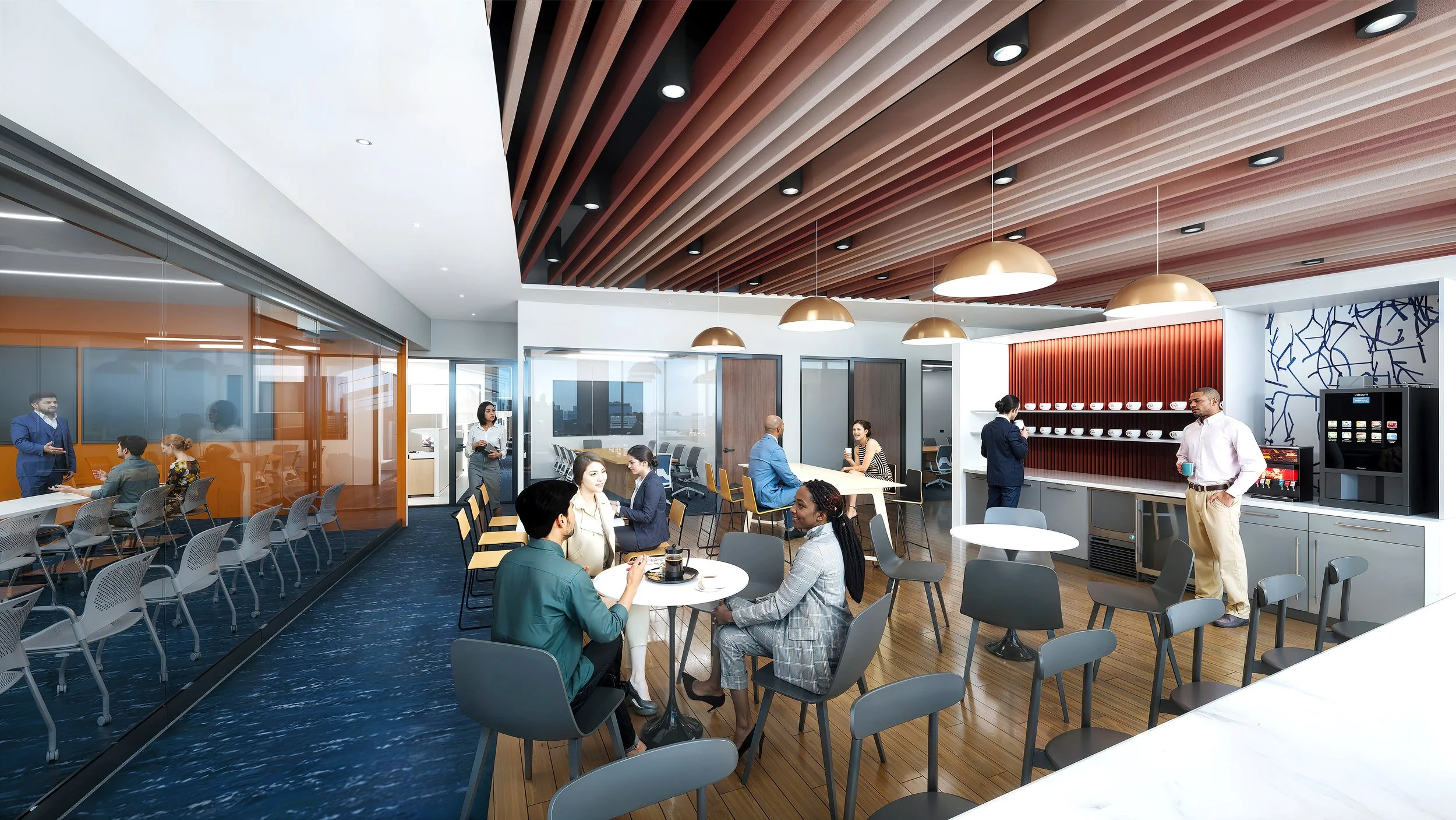 Flexibility is woven into every decision. Modular offices, hybrid meeting rooms, and gathering areas evolve with the pace of growth, while a balanced, human-centered layout supports both focus and connection. This workspace reflects the character of Heaven Hill: honoring its legacy while evolving to meet the demands of a modern workforce.