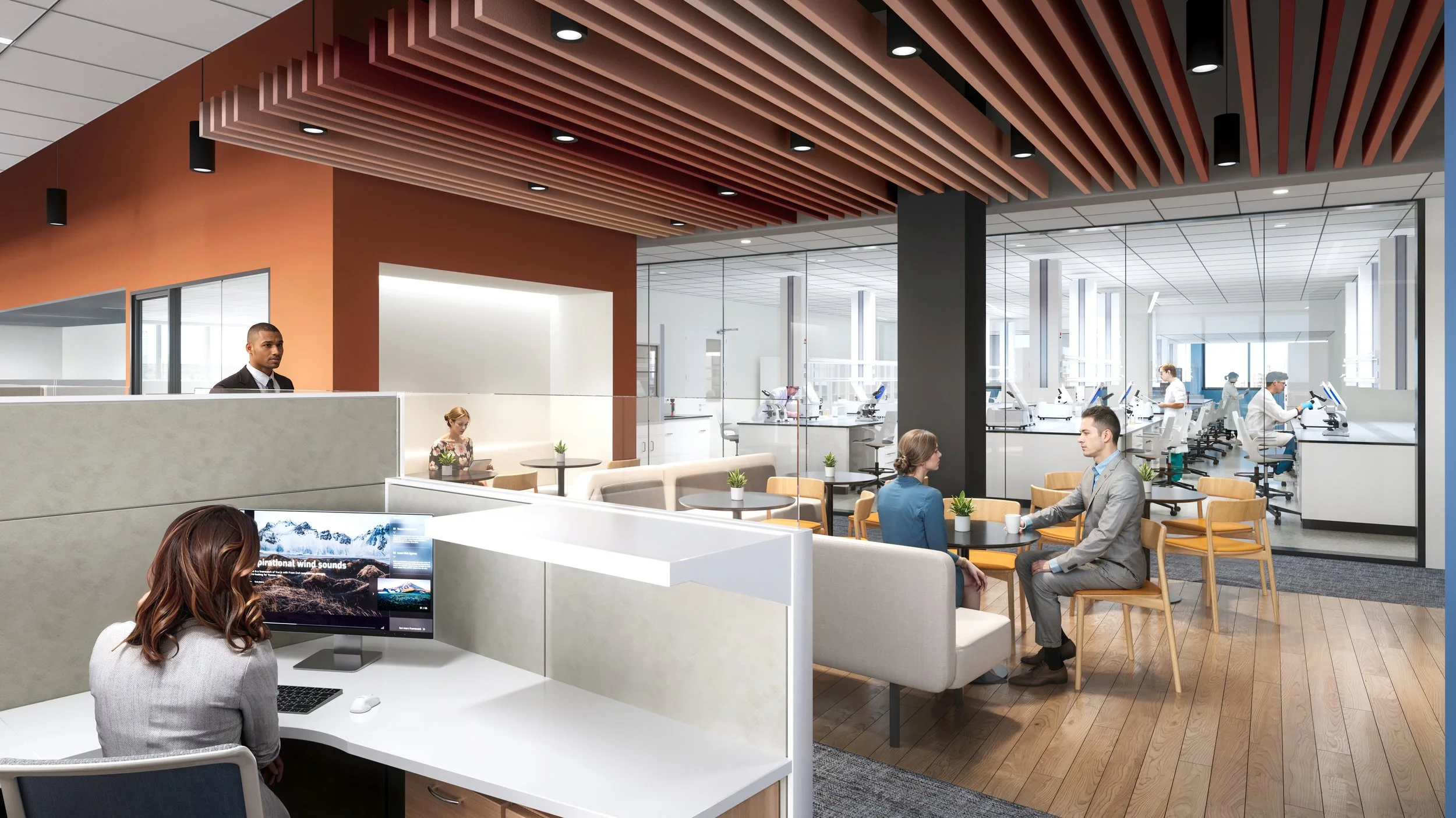 Highly technical lab environments remain clean and energizing. Adjacent workplace spaces are warmer and human-centered, with daylight, views, and wellness-driven amenities supporting balance within a dynamic setting.